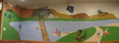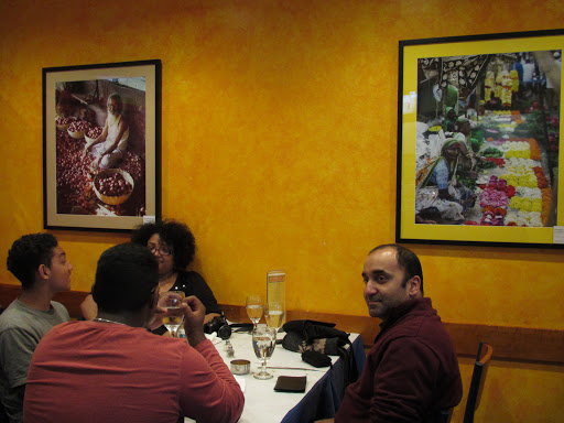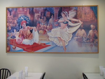 The other painting that caught my eye and made me chuckle is in another restaurant in Providence – Not Just Snacks. The painting has all the symbols of ‘exotic India’ bringing together different pieces of place and time in an unusual collage – elephant, peacock, Tajmahal, coconut, palm, and mango trees, a boy flying kite, a singer (Meerabai??) with a string instrument who is from some bygone era, and people who look like they are from northern India on the banks of a river (Ganga??) Oh and I forgot the deer mesmerized by the song Meerabai is playing/singing. Mountains behind the Tajmahal, the river plains in the middle and I am assuming desert behind Meerabai.