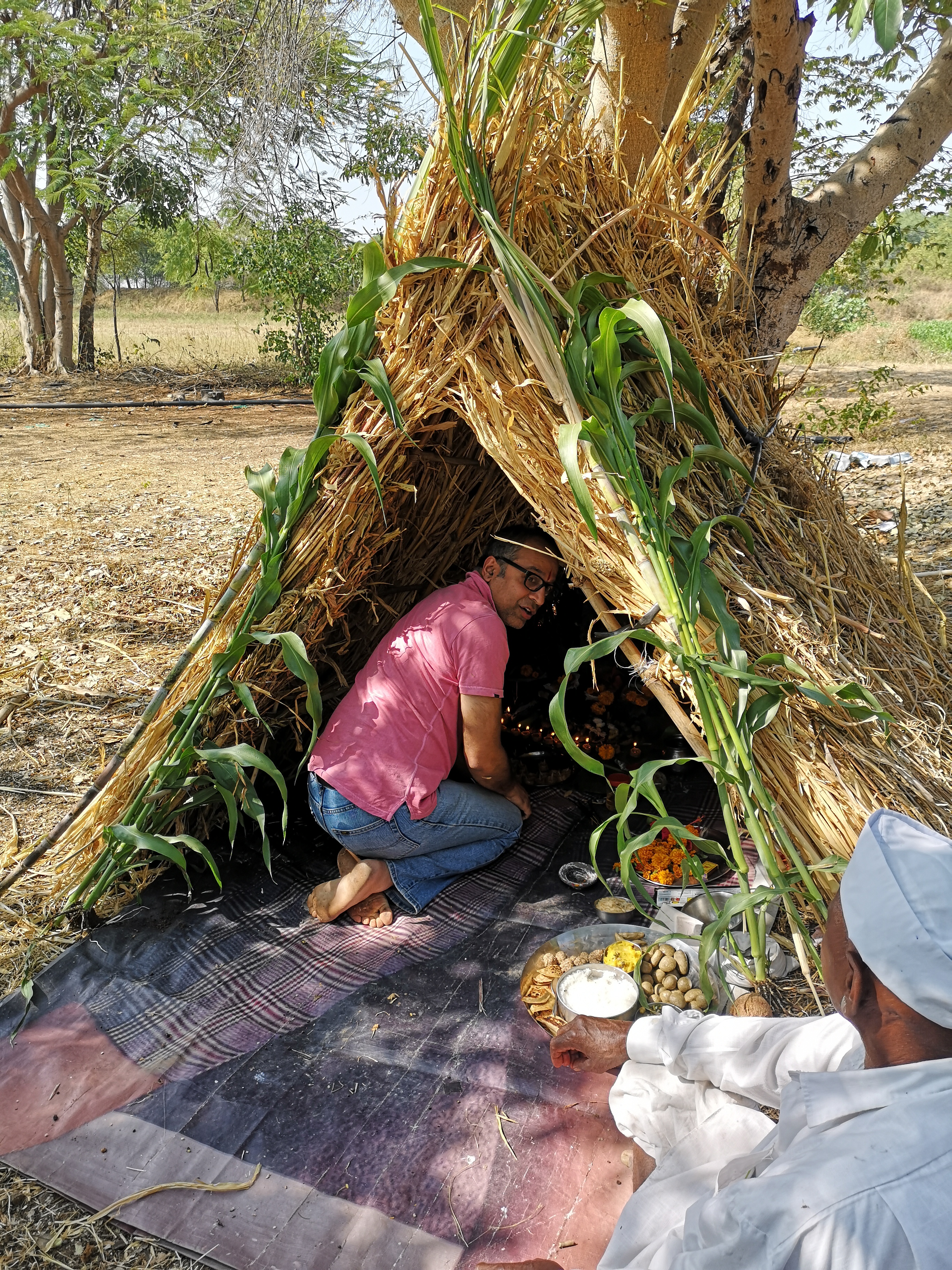 The pooja at the main location was done. Got some of the Prasad to mix it with the food being cooked in the communal kitchen. Gauri offered Prasad to the old gentleman, he received it in his cupped hands kept on his back. As he explained, ‘a blessing like that should take a bit of effort’. There are three more places the pooja is traditionally performed at JP Harali. One at the well, another in the mango orchard. Places that were once owned by other villagers. The traditional places of importance need to be honoured.