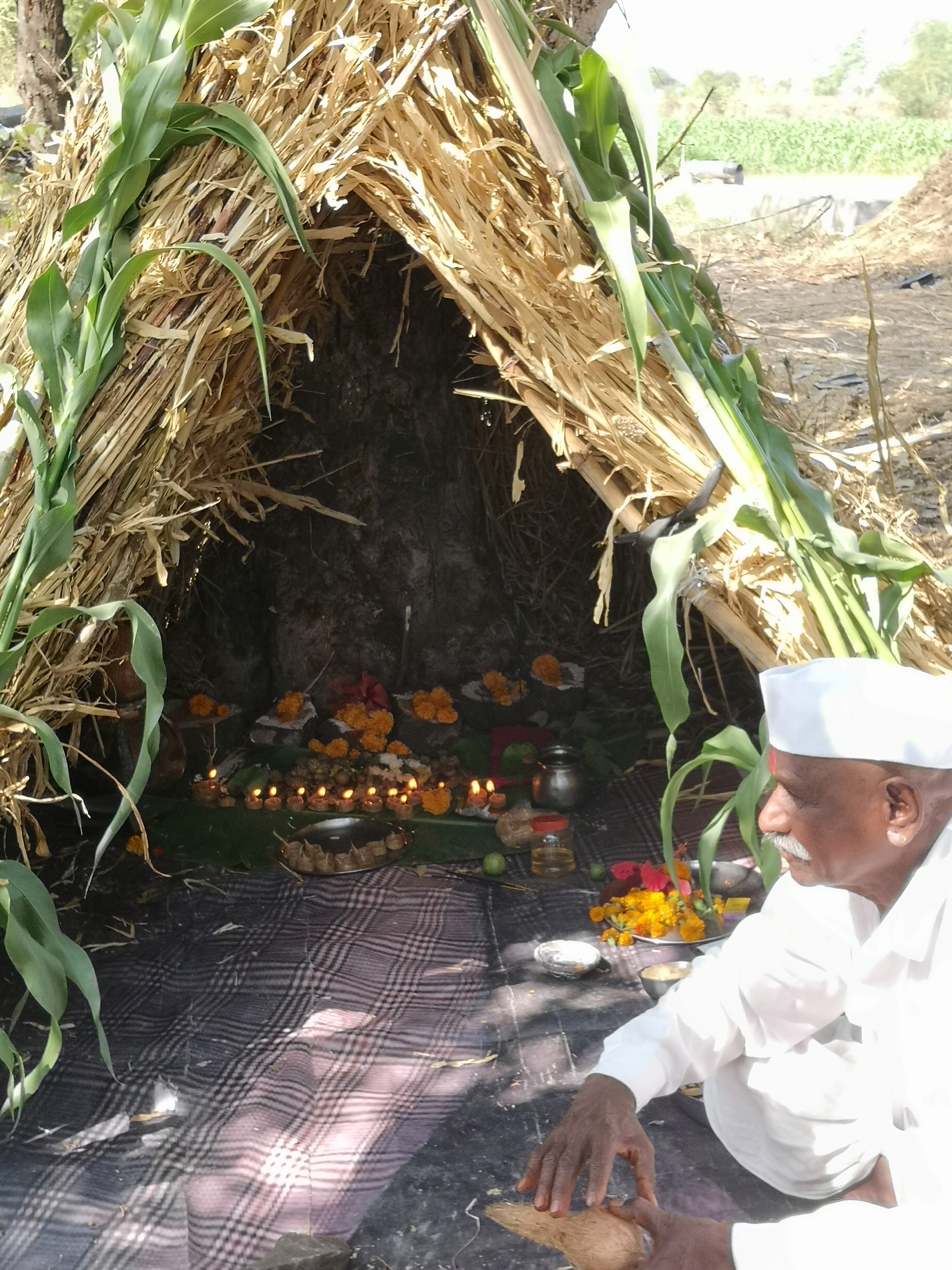 Vel amavasya is celebrated on the no moon day in the month of Margashirsh. A hut made of dried remnants of the crop is erected in the farm. Stones or mud roundels symbolising 5 pandavs and Draupadi are placed in it.